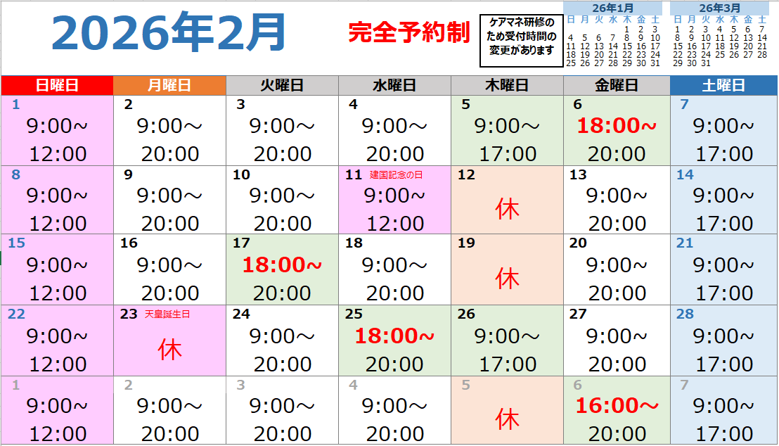 ※ケアマネージャー研修が入り、受付時間に変動があります。画像をご確認くださいね。