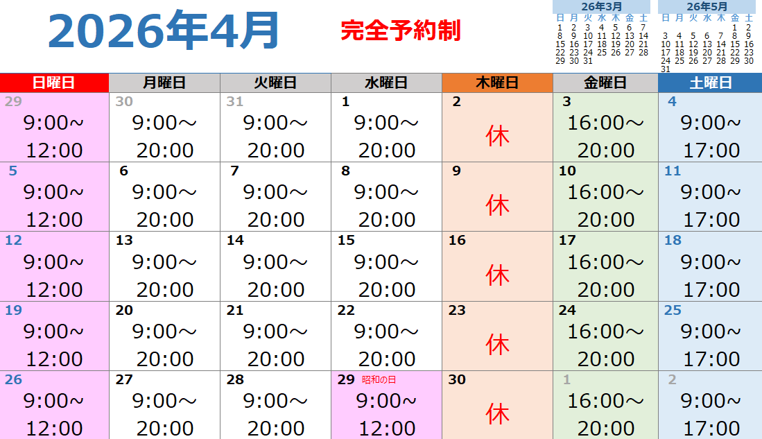 新規のご予約が取りにくくなってきておりますので、早めにご予約ください